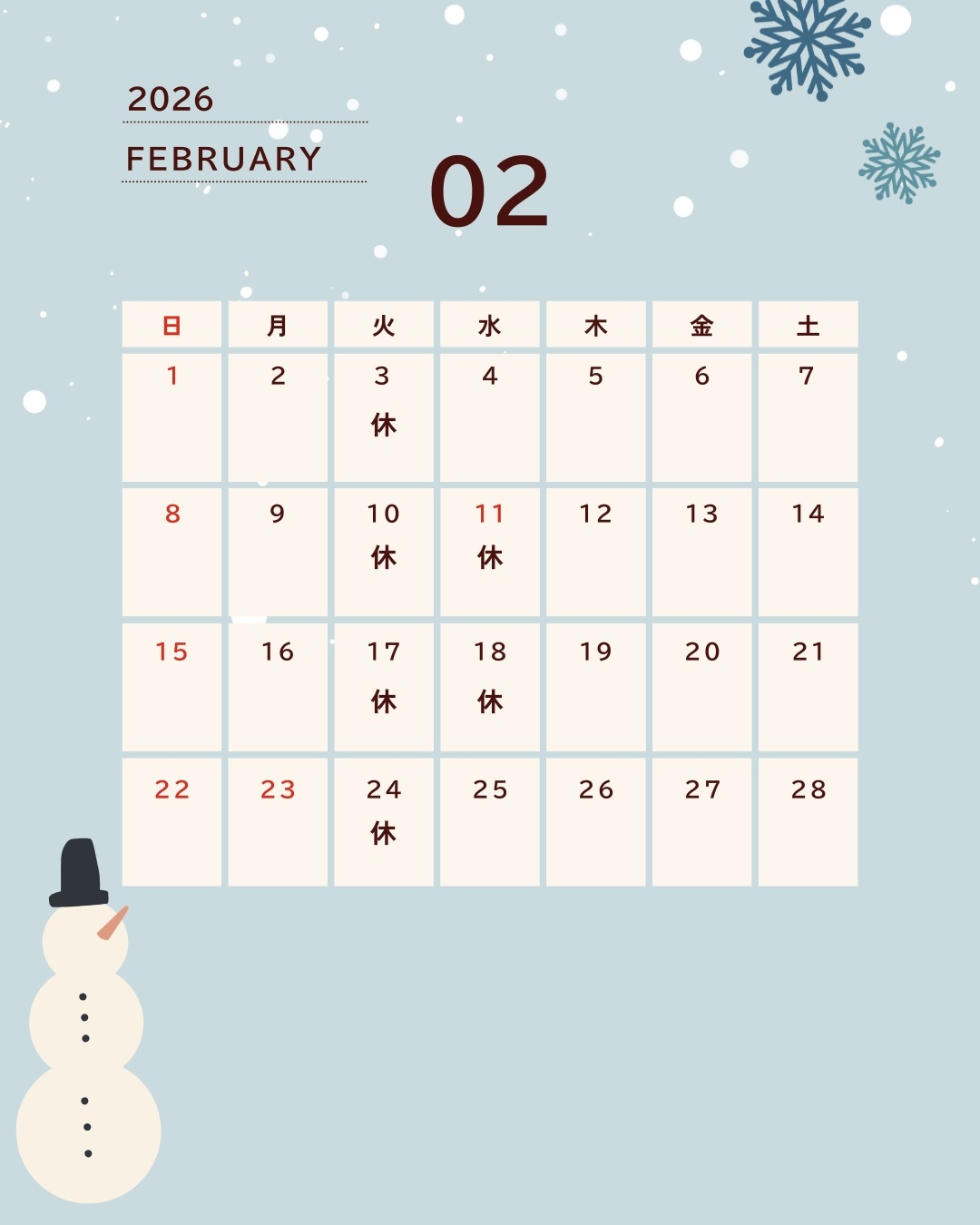 2月定休日のお知らせ ⛄❄
